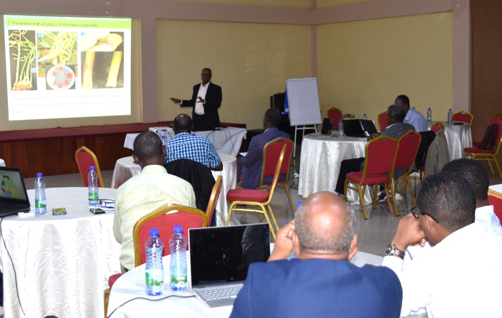 The workshop then continued with a presentation from EIAR on research efforts made thus far to improve ginger production management. The presentation discussed how the impact of the complex disease on the ginger crop has seriously impacted the country’s socioeconomic situation, with exports of Ethiopian ginger dropping dramatically since 2012, from US$24 million to nearly nil. It was also revealed that more than 13 private ginger investment farms had gone bankrupt. The EIAR made efforts and developed various control strategies for ginger bacterial wilt and leaf spot disease. There is, however, no single effective control measure. Therefore, the presenter suggested more effort should be made to improve the soil health and availability of clean planting materials.