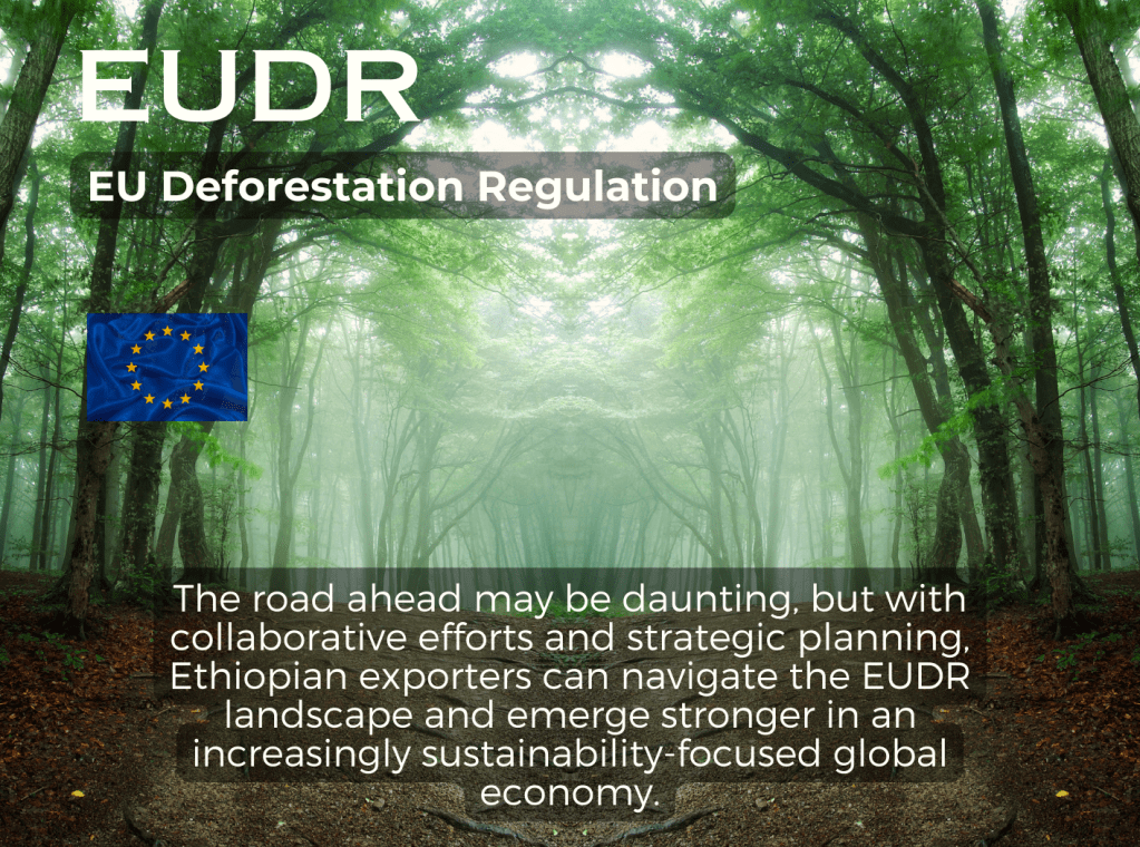 In conclusion, the journey towards EUDR compliance presents both challenges and opportunities for Ethiopian exporters. By proactively addressing these challenges and leveraging available support mechanisms, Ethiopian products can continue to find success in the EU market while aligning with sustainable and climate-friendly trade practices. In the long term, it is expected that also other countries will have similar demands so the sectors need to get prepared so as not to lose export destinations. The road ahead may be daunting, but with collaborative efforts and strategic planning, Ethiopian exporters can navigate the EUDR landscape and emerge stronger in an increasingly sustainability-focused global economy.