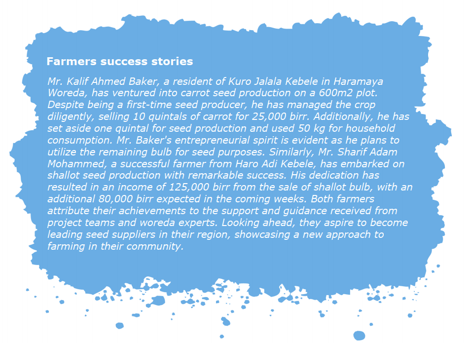 As the intervention progressed, success stories began to emerge. Kalif Ahmed Baker, a young farmer from Kuro Jalala kebele, demonstrated remarkable dedication to carrot seed production. His proactive approach and diligent management resulted in a successful harvest, enabling him to sell a substantial quantity of carrots and reserve a portion for seed production. Similarly, Sharif Adam Mohammed from Haro Adi kebele achieved significant success in shallot seed production, utilizing his harvest for both market supply and future seed production.