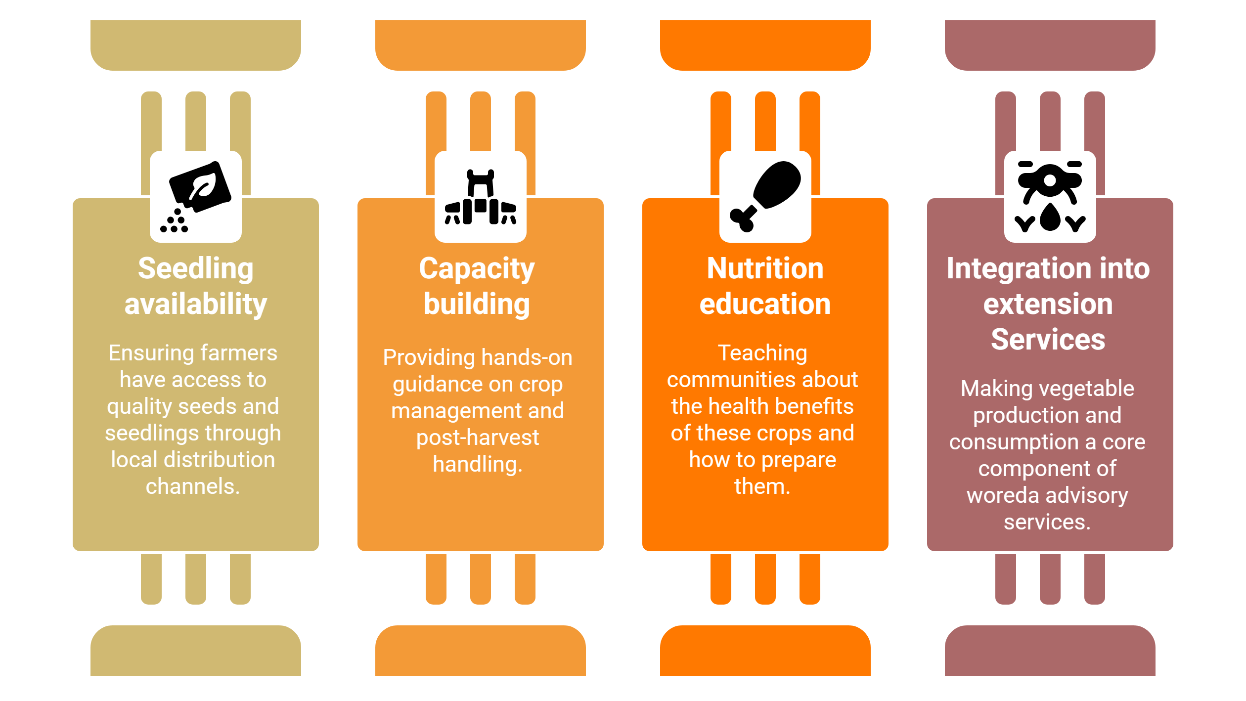 Recognizing the stated needs, the Worabe Agricultural Research Center team led an effort to promote dietary diversity in collaboration with agricultural offices and other stakeholders by considering strategies related to (i) seedling availability, (ii) capacity building, (iii) nutrition education, and (iv) ensuring the integration of the evidence into the mainstream extension service (see ???).